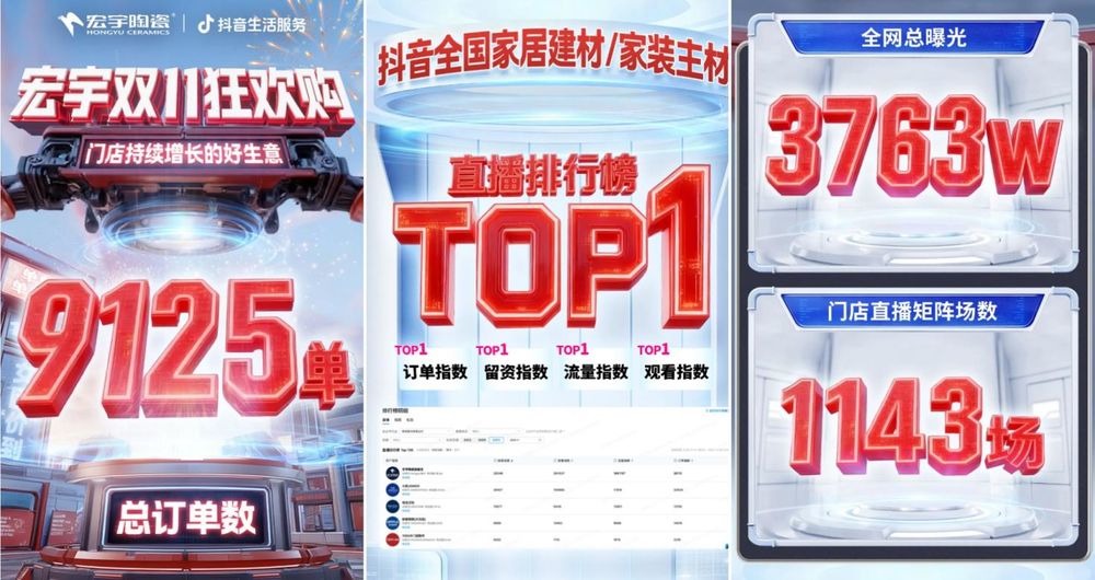 双11期间,宏宇陶瓷初创“短曲融合+团播互动”模式,组建星从播团,以9125单、3763万全网、1143场门店曲播的和绩抖音相关榜单TOP1,六项焦点数据位列第一。