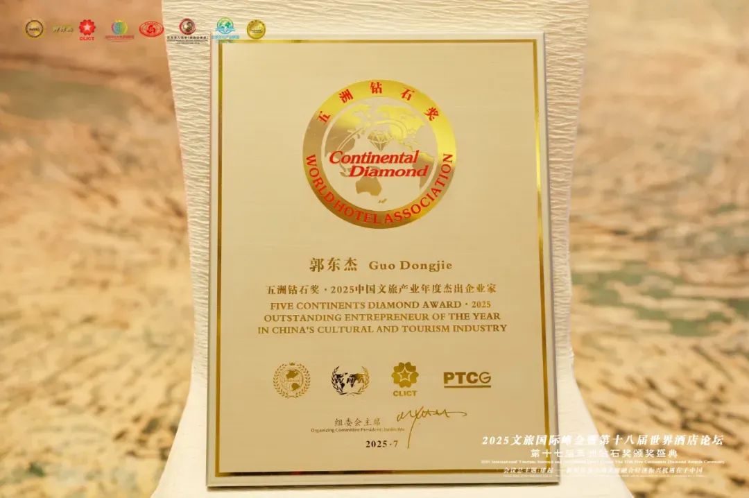 近日,“2025文旅国际峰会暨第十八届世界酒店论坛第十七届五洲钻石颁盛典” 正在海南海口举行。正在第十七届五洲钻石颁盛典上,华程国旅集团董事长郭东杰被授予 “五洲钻石2025中国文旅财产年度精采企业家” 称号。