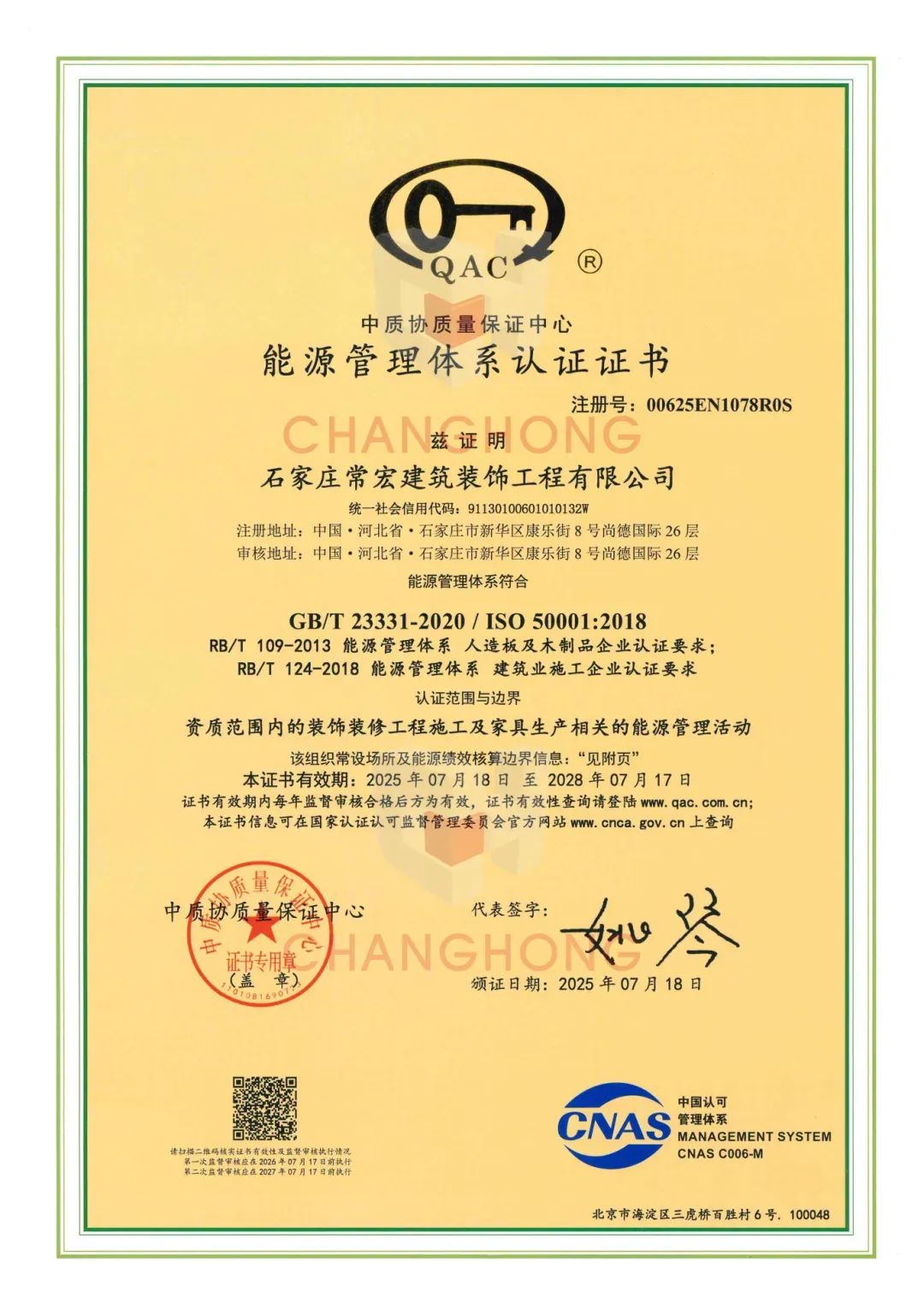 近日,常宏粉饰正式通过能源办理系统认证(ISO 50001),取得中质协质量核心颁布的认证证书。这标记着常宏粉饰正在能源办理规范化、绿色低碳成长范畴迈上了新台阶,为行业可持续成长树立新标杆。